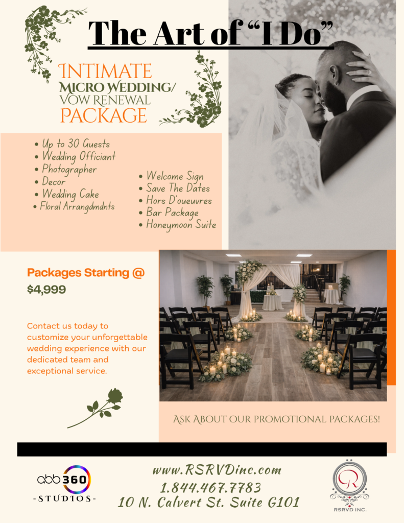 Located in the heart of Downtown Baltimore, ABB360 Art Gallery offers a modern and sophisticated setting perfect for intimate ceremonies. Our gallery provides a unique backdrop that blends art, elegance, and unforgettable moments.